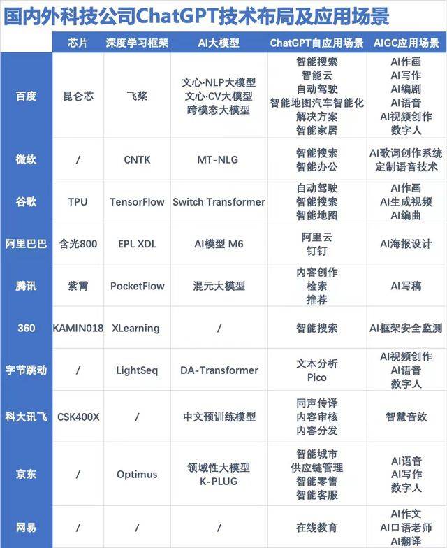相比之下,目前宣布进军ChatGPT的一些互联网企业,技术研发和进度则处在第二梯队。比如,360有深度学习平台Xlearning,但没有相关大模型。同样宣布进军ChatGPT的网易有道,是AI芯片、深度学习框架、AI大模型都没有,只是有应用场景在线教育,这与传出要参与ChatGPT的学而思类似,企业只是有学习机的应用场景,但没有相关技术储备。