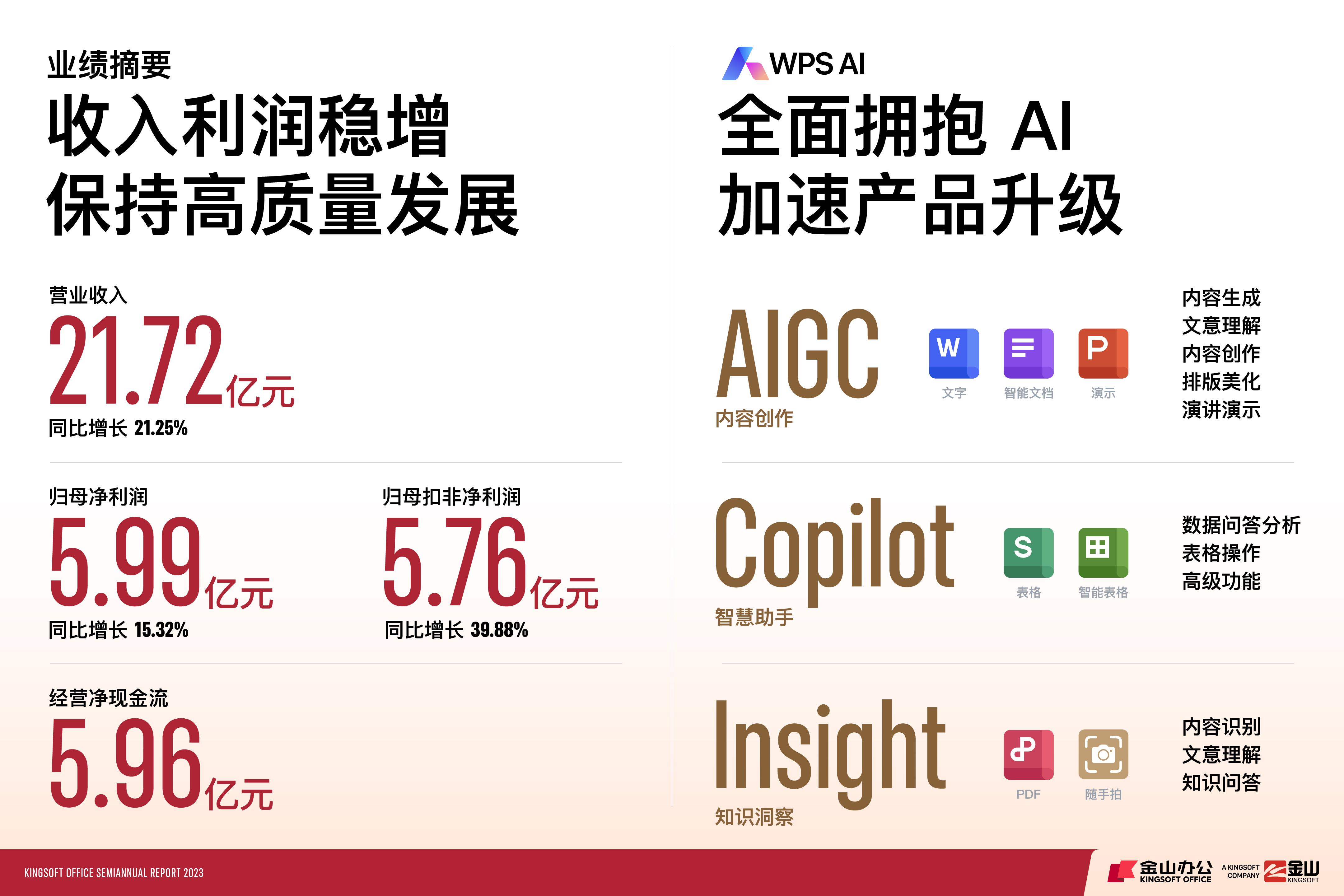 8月22日晚间,金山办公正式公布了2023半年报数据。2023年上半年,金山办公营收与净利润实现双增长,营业收入21.72亿元,同比增长21.25%;归属于母公司所有者净利润5.99亿元,同比增长15.32%;归属于母公司所有者扣除非经常性损益净利润5.76亿元,同比增长39.88%,盈利能力持续提升。