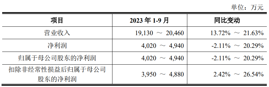 浩辰软件预计2023年1-9月实现营业收入19,130万元至20,460万元,同比增长13.72%至21.63%;预计净利润/归属于母公司股东的净利润4,020万元至4,940万元,同比下降2.11%至增长20.29%;预计扣除非经常性损益后归属于母公司股东的净利润3,950万元至4,880万元,同比增长2.42%至26.54%。