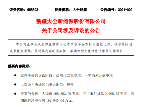 (记者 刘小菲)大全能源昨日晚间发布公告称,公司与供应商之间就合同履行及标的产品质量等问题产生诉讼纠纷,涉案金额为19.58亿元,其中未付款2908.65万元,预计或有经济损失19.29亿元。