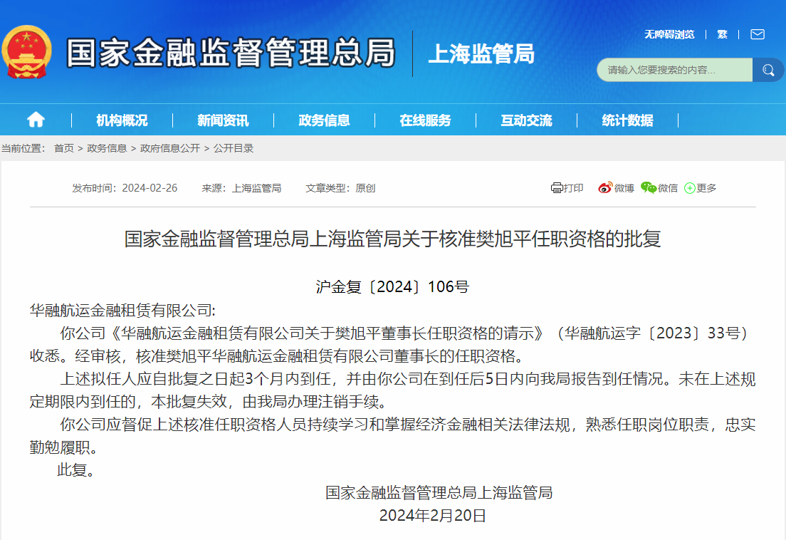 日前,国家金融监管总局官网公布相关批复信息显示,《华融航运金融租赁有限公司关于樊旭平董事长任职资格的请示》获国家金融监管总局上海监管局批复,核准樊旭平华融航运金融租赁有限公司(简称:华融航运金租)董事长的任职资格。