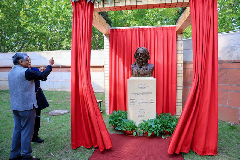 10月25日,著名艺术家袁熙坤创作的印度文学家泰戈尔雕塑落成仪式在印度驻华大使馆举行。印度驻华大使罗国栋、著名艺术家袁熙坤、中央美术学院雕塑系教授、全国城雕委主任、中国雕塑学会名誉会长曹春生、北京画院原副院长杜军山、社会各界嘉宾共同出席活动,见证这一中印文化交流的重要时刻。