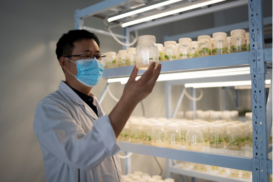 今年以来,拼多多加大投入,加速农业科技成果转化。图为烟薯25号育成人辛国胜正在进行脱毒种苗繁育,扩繁的种苗将供应给农户种植。凯馨|摄