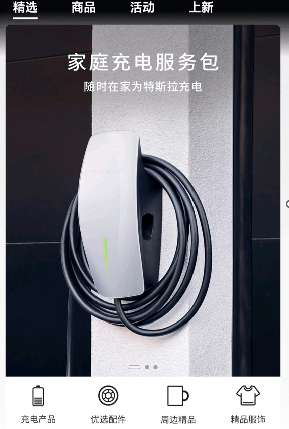 打开京东旗舰店首页,被顶在最前面的是充电产品、优选配件、周边精品和精品服饰四个大类。在页面顶部滚动推荐栏放置的则是家庭充电服务包、遥控钥匙以及兔年帽衫三款商品,相信正是目前主推的产品。