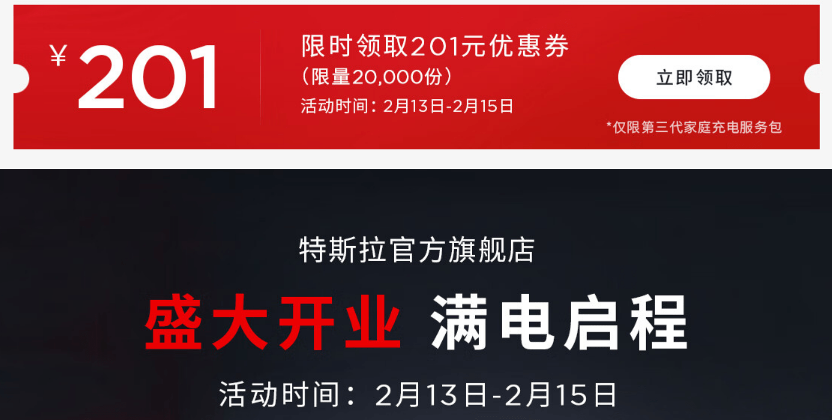 上线之后,店铺官方只推出了一项2月13-15日限时领取的201元第三代家庭充电服务包优惠抵扣券,限量20000份。截止发稿时,活动期限已过,移动端也已下架相关信息,但网页端仍保留着活动海报。由此推测,店铺运营仍未走上轨道,日常管理上仍存在一些缺陷。