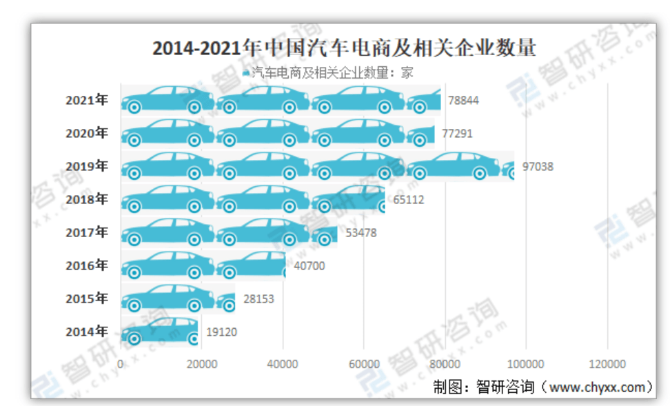 数据显示,2020年中国汽车电商相关企业数量锐减至77291家,自有统计以来首次出现负增长。交易规模虽然仍在增长,但增速从大幅缩水至7.2%,并在2021年进一步下滑至6.89%。