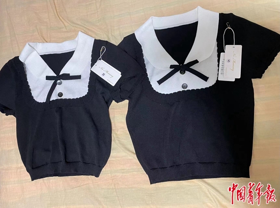 记者在同一家网店购买了同款的两件上衣,到货后比对发现,S(小码,右)比M(中码,左)大。中青报·中青网见习记者 陈晓/摄