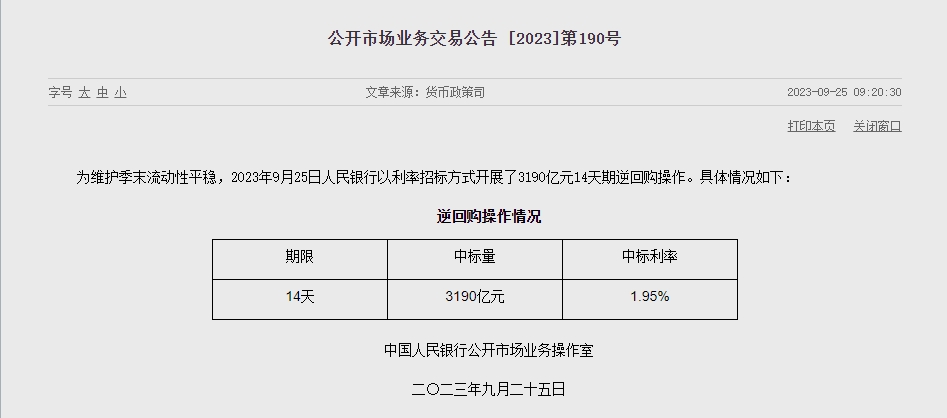 央视网消息:中国人民银行发布公告,为维护季末流动性平稳,2023年9月25日人民银行以利率招标方式开展了3190亿元14天期逆回购操作。