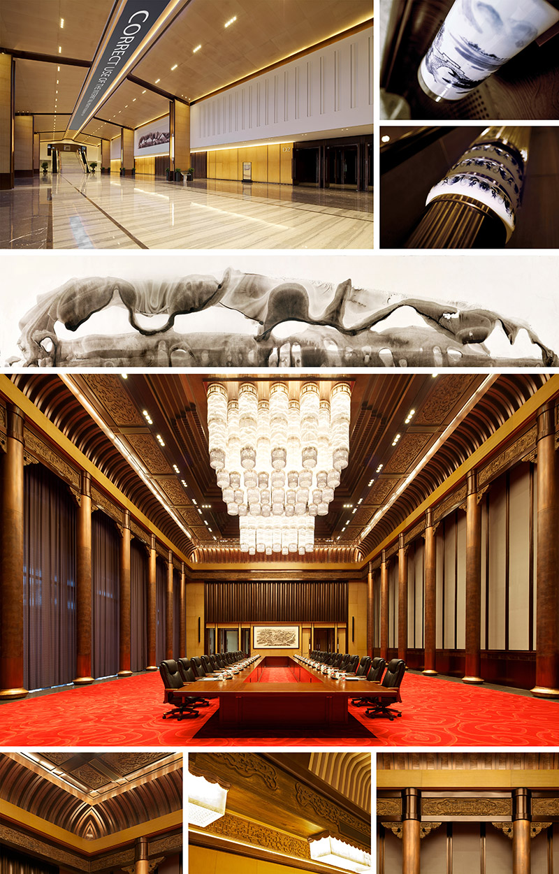 这是改革开放以来,我国第一次从建筑、景观到室内空间完全由中国设计团队自主原创完成的国际会议中心。建筑设计由北京市建筑设计研究院有限公司在原有建筑基础上改造完成,北京建院装饰承接了15万平方米会议中心的室内设计工作,并与建筑师共同构建了“廿国共宇、水墨中国”的设计思想。主会议厅以“廿国共宇、小瀛洲”为主旨,空间塑造上既通过方正和轴向设计体现气势宏伟的大国风范,又通过青花瓷等经典特色设计元素,体现出江南的细腻和灵动。会议中心桌椅也是中国传统的圈椅,极具历史和现实交织的韵味。其它空间则以“水墨中国”为主旨展开,行云流水尽显江南风韵,将中国文化中的精髓元素用洗练的手法表达出来,做到弱形强势、含而不漏。用设计语言完美呈现了“创新、活力、联动、包容”的大会主题,真正达到了以国际化的视野,用现代设计语言呈现中国文化的精神和内涵。