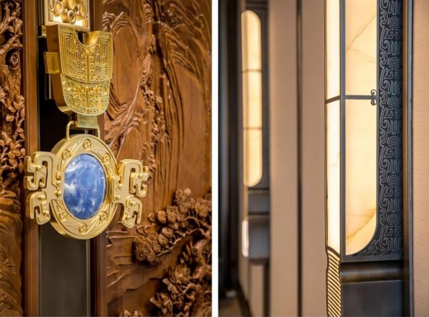 会议中心空间运用现代的设计手法呈现了古镇河道两侧的古宅映象,壁灯造型结合蓝印花布,青花瓷,将千年的印染历史、精湛的工艺相结合。双边会议厅提取乌镇古建中的柱基、华拱造型和香樟木雕刻唤起了乌镇历史记忆。体现着当今互联网时代的现代生活和传统文化的交融、共生。