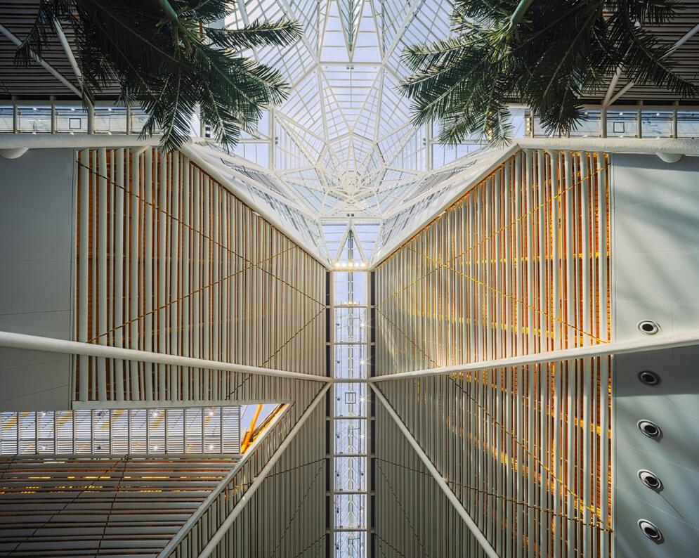 设计通过多种手段打破建筑的封闭感,使建筑和环境、室内和室外相互交融。结合建筑使用特点,设计虚化室内外边界。楼内区域采用了半开敞式设计,在中央商业区外围设置室外休闲观景平台,在指廊候机区分段引入精致庭院,在指廊和主楼之间集中设置绿化庭院。