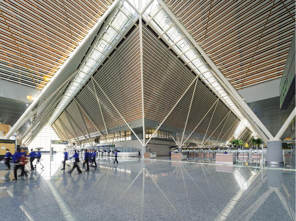 机场项目从立项到建设,一直受到国家高度重视,也受到柬方各界高度关注。为确保高标准完成室内设计任务,北京建院装饰组建了一支精干的技术队伍,提出“遇见吴哥”的设计理念,以功能布局为基础,以结构系统为支撑,利用三角网格控制建筑造型,以现代的建筑语言向人们传递历史深邃的“吴哥印象”。