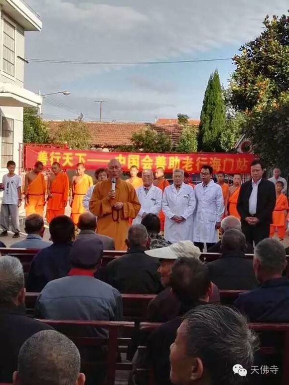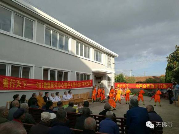 2016年农历9月初9,是中华民族的传统节日——重阳节,在这个尊老、敬老、爱老、助老的美好日子里,海门市天佛寺携手981健康医学中心及河南省会善助老基金会,走进海门悦来镇敬老院,为老人带去了慰问金、慰问品和精彩的少林功夫表演。曾经担任国家主要领导保健医生的团队,亲临现场给老人们进行慈善义诊。