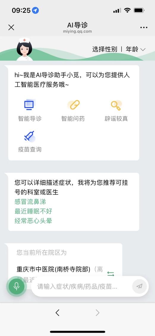 “重庆市中医院微信公众服务号”上有一个功能是“智能导诊”,提供了智能导诊、智能问药、辟谣较真等人工智能医疗服务,患者只需要描述症状,就能准确推荐可挂号的科室或医生,这为患者提供了极大便利。