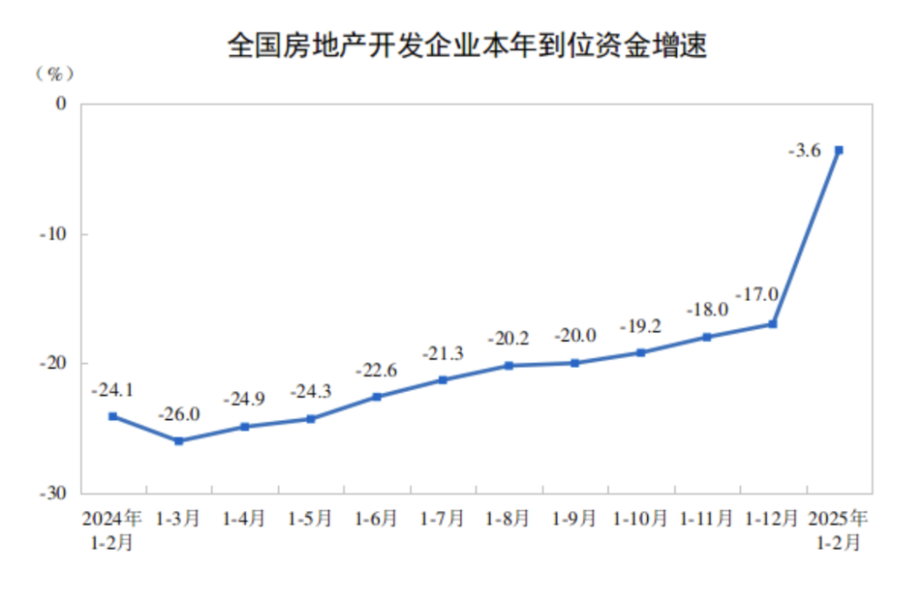 国家统计局数据显示,今年前两个月,房地产开发企业到位资金15577亿元,同比下降3.6%,降幅比2024年全年收窄了13.4个百分点。
