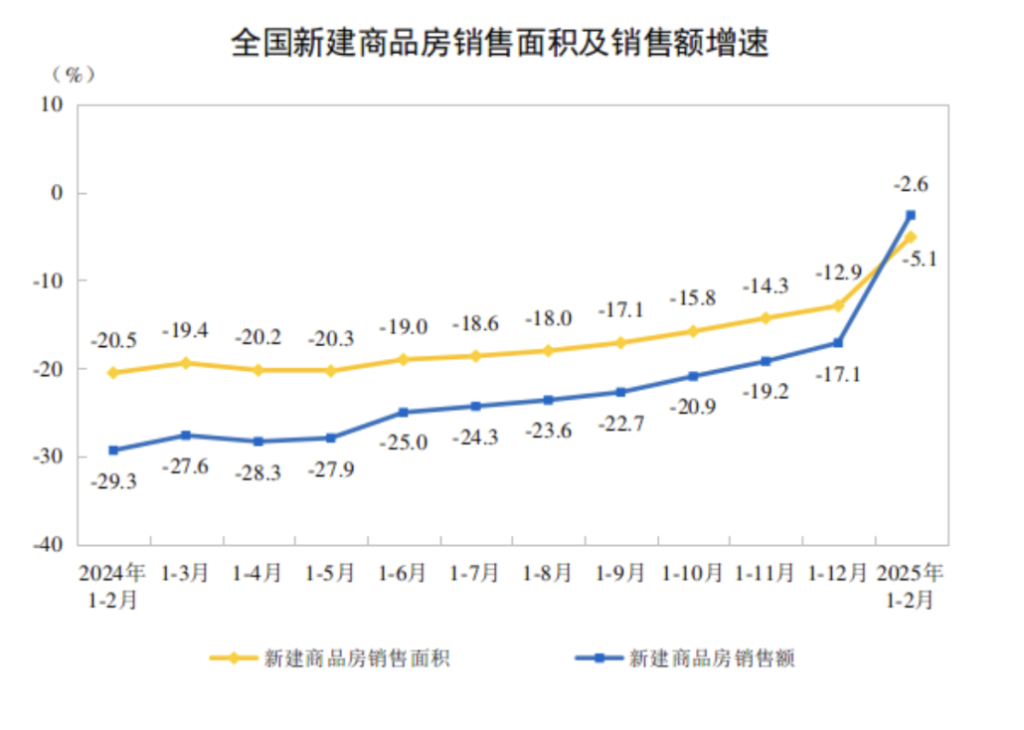 3月17日,国家统计局发布2025年1-2月份全国房地产市场基本情况。国家统计局数据显示,今年前两个月,房地产开发投资同比降幅比2024年全年收窄0.8个百分点,其中住宅投资降幅收窄了1.3个百分点;从销售端数据看,今年1-2月份,房地产市场交易总体平稳,全国新建商品房销售面积和销售金额同比降幅分别比上年全年收窄了7.8个和14.5个百分点。从监测的40个重点城市来看,前两个月新建商品房销售面积和销售金额同比分别增长了1.3%和7.1%。