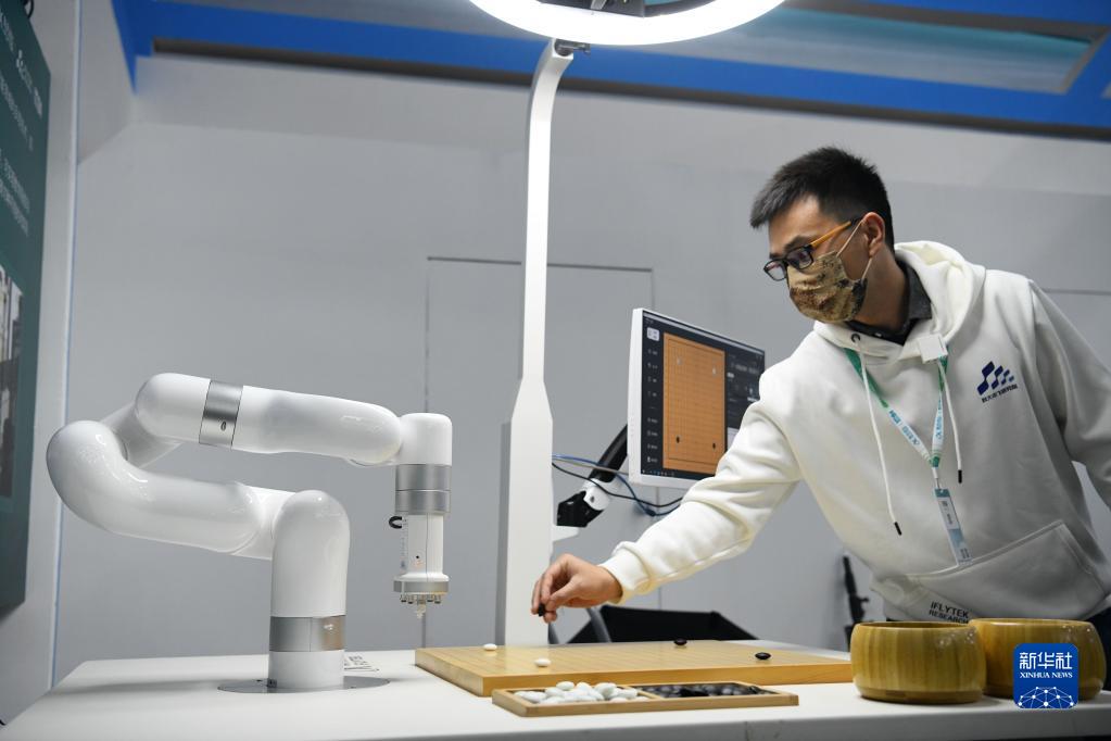 11月17日,工作人员与一款面向围棋教学的智能机器人互动。