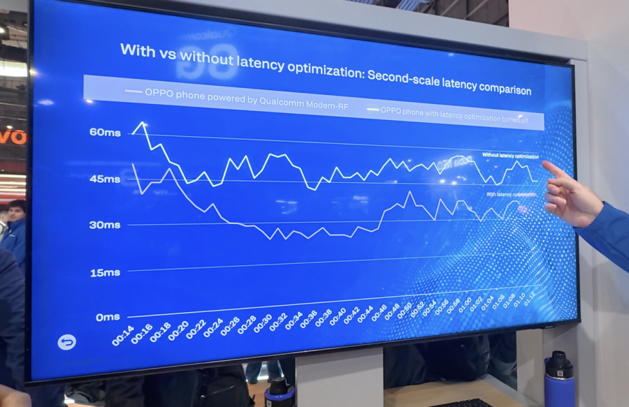 OPPO手机演示了一个很多年轻人经常触及的案例:在人流密集的商场咖啡厅里来上一局电子竞技游戏。高通的调制解调器及射频系统由于能够利用智能数据服务识别特定游戏数据流,从而进行底层加速,降低游戏平均时延,并且优化副卡的信号,减少其对主卡连接的干扰。对比测试显示,在相同网络条件下,搭载高通调制解调器及射频系统的OPPO手机在开启时延优化后,可将平均时延降低25%。这意味着,通过AI赋能的高通5G调制解调器,即便玩家处于激烈对战中或执行关键操作动作时,网络连接也不太可能因其他应用或后台进程而受到干扰。