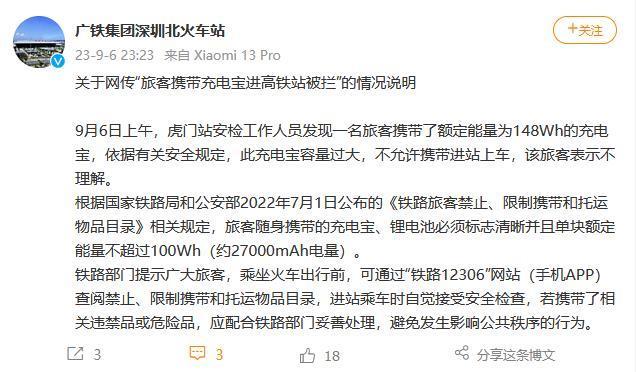9月7日电 针对网传“旅客携带充电宝进高铁站被拦”,广铁集团深圳北火车站6日晚在官方微博发布情况说明。