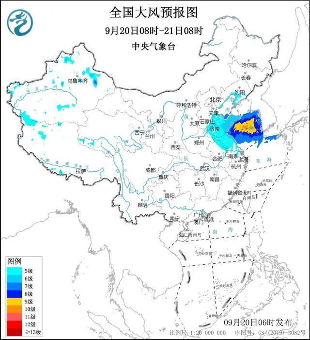 预计,9月20日08时至21日08时,黄海中部和南部海域将有9级、阵风10级的大风;新疆沿天山地区和东部、辽宁南部、山东和江苏大部、河北西南部、安徽东南部等地大部有5级、阵风6级的大风,其中,山东中东部部分地区有6级、阵风7级的风。